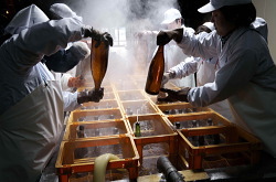 | 上槽された清酒の殺菌と酵素の働きを止めるため、60℃前後の熱を加える事によって低温殺菌します。これは「火落ち」[※1]を引き起こす乳酸菌の一種、火落菌を殺菌するのに非常に効果的で、新酒の貯蔵前の重要な作業です。 また、純米大吟醸や純米吟醸酒は、酒自体の香りや旨みをそのまま封じ込めるために瓶詰め後、特製の瓶燗機で64℃まで一本一本丁寧に加温し、瞬時に冷却する事でヒネ[※2]を防ぎます。<上画像参照> この後、貯蔵タンクや瓶で熟成された『田酒』が皆様のお手元へと届きます。 |